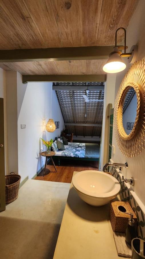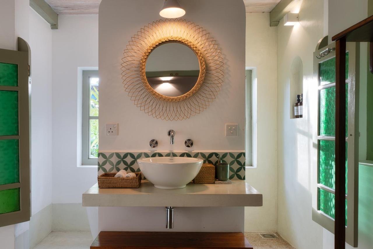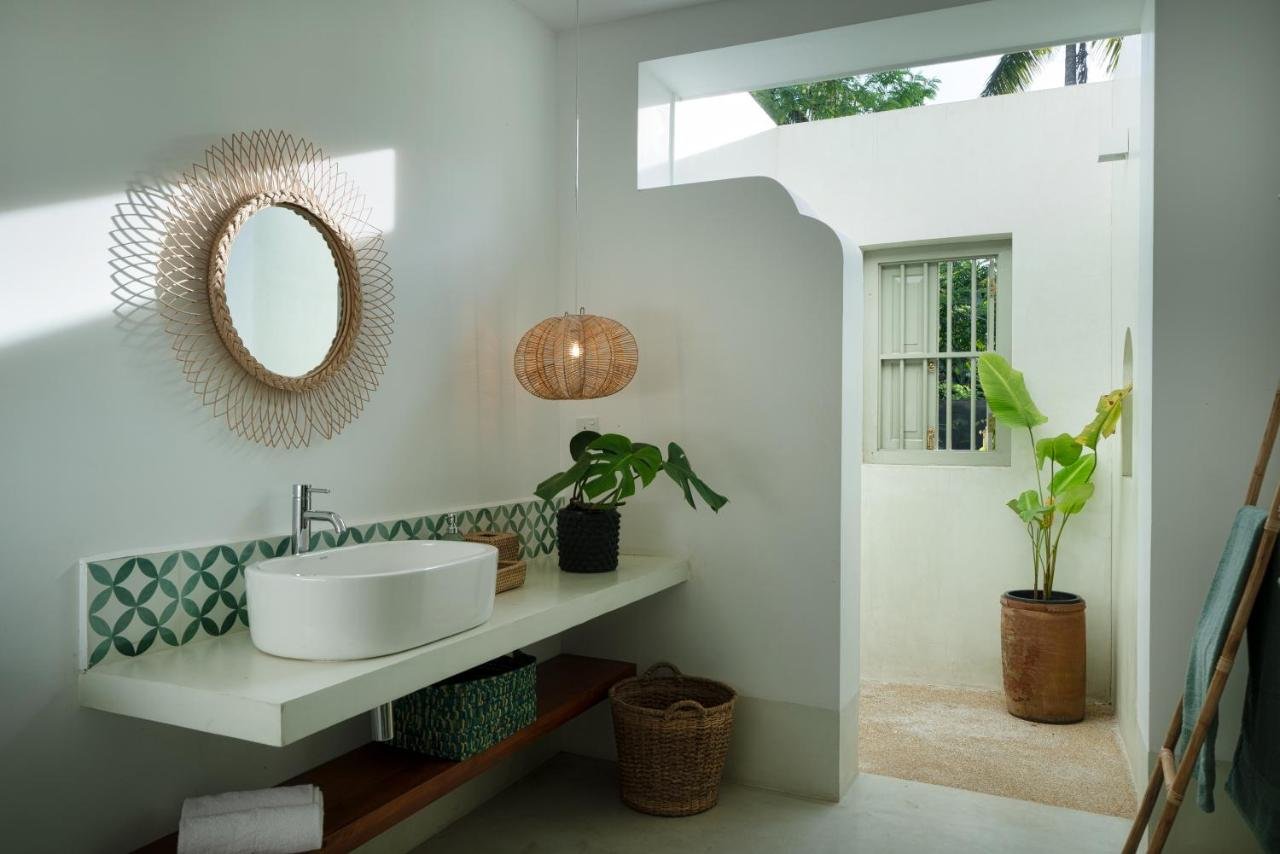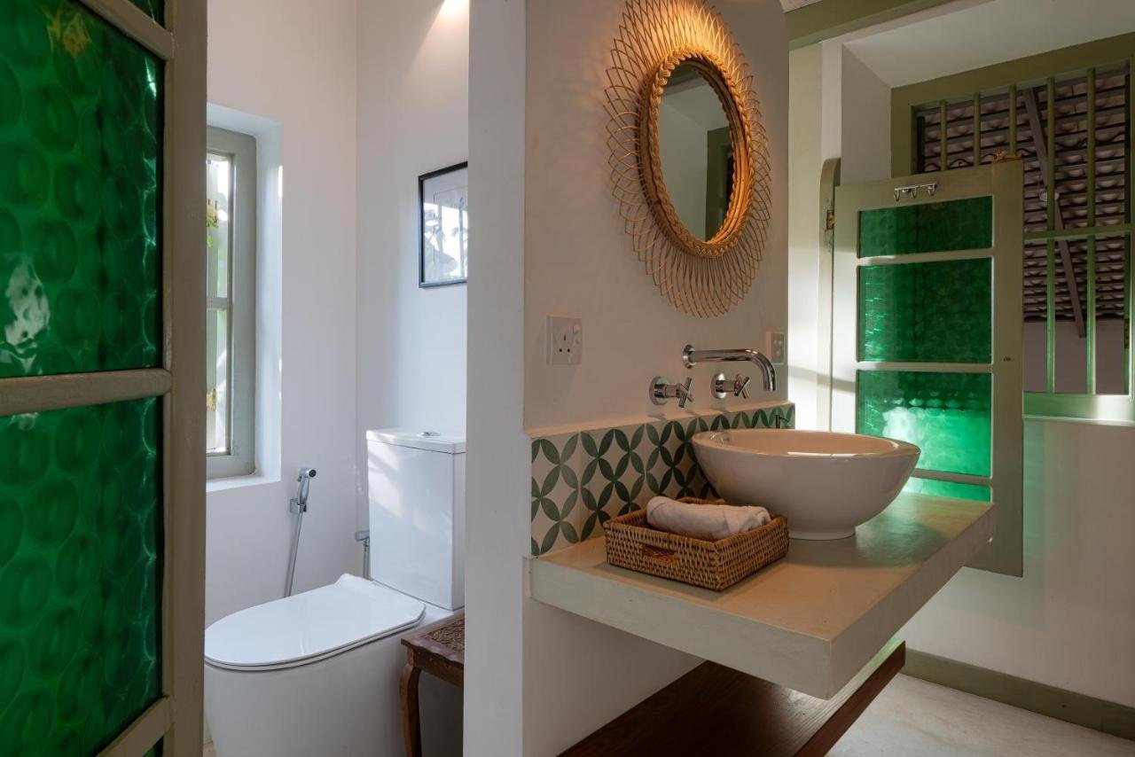 The bathroom renovation within the villa exemplifies a perfect blend of traditional Sri Lankan elements and contemporary design. The space features handcrafted wooden cabinetry that echoes the villa's architectural heritage, while sleek, minimalist fixtures provide modern functionality. Natural light floods in through thoughtfully positioned windows, enhancing the serene atmosphere. Elegant tiles with subtle patterns add texture, complementing the polished cement floors. The result is a tranquil retreat that maintains a connection to the home’s rich history while offering a spa-like experience, perfect for relaxation and rejuvenation.
